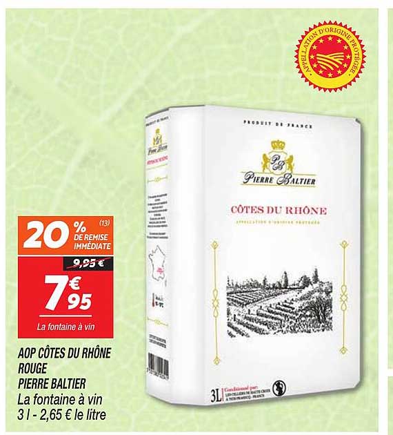Découvrez une opportunité exceptionnelle avec l'AOP Côtes du Rhône Rouge de Pierre Baltier, disponible en fontaine à vin de 3 litres. Parfait pour vos repas en famille ou entre amis, ce vin rouge est caractérisé par sa richesse et sa profondeur de goût, une véritable invitation à savourer de bons moments au quotidien.