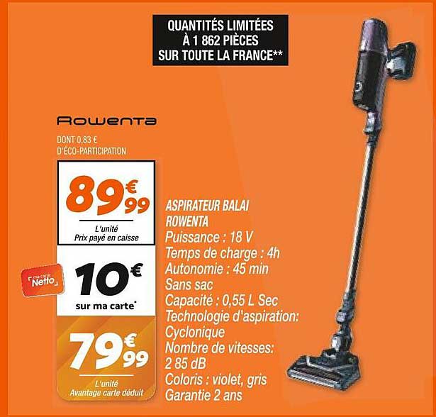 Découvrez l'offre de Aspirateur Balai Rowenta chez Netto! Cette offre fantastique est maintenant disponible dans le nouveau catalogue de Netto. Profitez de cette occasion et économisez considérablement sur votre achat.