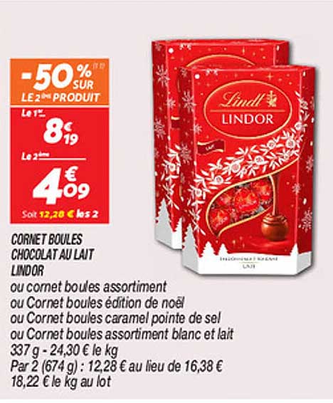 Découvrez dès maintenant la offre CORNET BOULES CHOCOLAT AU LAIT LINDOR dans le catalogue de Netto. Cette offre est valable du 10/12/2024 au 16/12/2024.