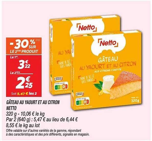 Découvrez le délicieux Gâteau au Yaourt et au Citron de Netto, un dessert irrésistible qui ravira vos papilles. Avec cette offre promotionnelle, profitez de -30% sur ce succulent produit, parfait pour terminer un repas sur une note fraîche et sucrée. Qui peut résister à un bon gâteau moelleux, agrémenté de saveurs de citron ? Ne manquez pas cette chance d’égayer vos moments gourmands.