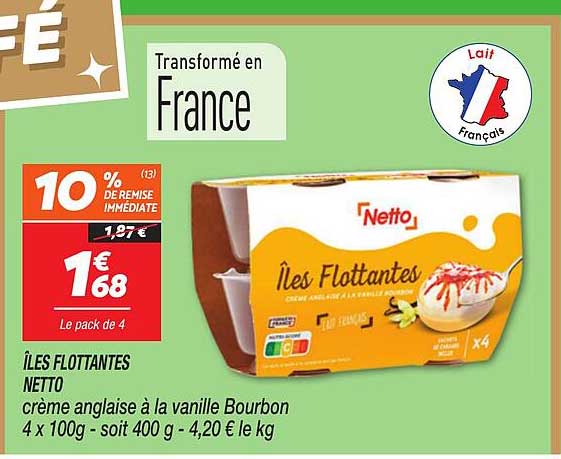 Découvrez les délicieuses Îles Flottantes de Netto, une crème anglaise à la vanille Bourbon qui saura séduire vos papilles. Profitez d'une remise de 10 % sur cette offre valable du 2 au 8 décembre 2025. Un dessert parfait pour vos repas en famille ou entre amis, ces petites douceurs légères et gourmandes sont à la fois un régal pour les yeux et pour le palais.