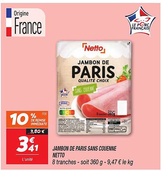 Découvrez l'offre de Jambon De Paris Sans Couenne Netto chez Netto! Cette offre fantastique est maintenant disponible dans le nouveau catalogue de Netto. Profitez de cette occasion et économisez considérablement sur votre achat.