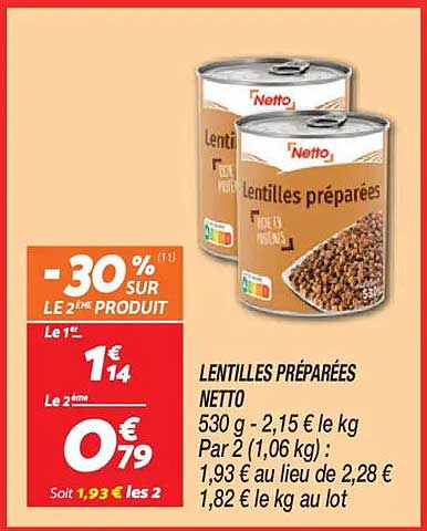 Découvrez une offre irrésistible sur les lentilles préparées Netto, disponibles à un prix exceptionnel cette semaine. Pas seulement délicieuses, ces lentilles sont un choix sain et pratique pour vos repas quotidiens. Profitez de cette promotion pour faire le plein de protéines et de fibres, tout en économisant.