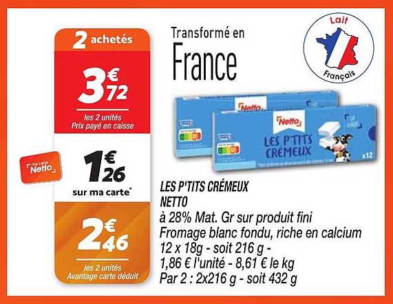 Découvrez les P'tits Crémeux de Netto, un incontournable dans votre réfrigérateur ! Avec cette offre exceptionnelle, vous pouvez profiter de deux unités pour seulement 3,72 € en caisse, soit une occasion à ne pas manquer entre le 1er et le 7 avril 2025. Idéal pour les petits déjeuners ou les collations, ce fromage blanc fondu promet de ravir les papilles des petits et grands !