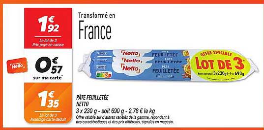 La pâte feuilletée est un incontournable en cuisine, particulièrement pour ceux qui apprécient la pâtisserie et la cuisine maison. Sur cette page, découvrez l’offre spéciale sur le lot de 3 paquets de pâte feuilletée Netto, idéale pour préparer des plats savoureux tout en réalisant des économies.