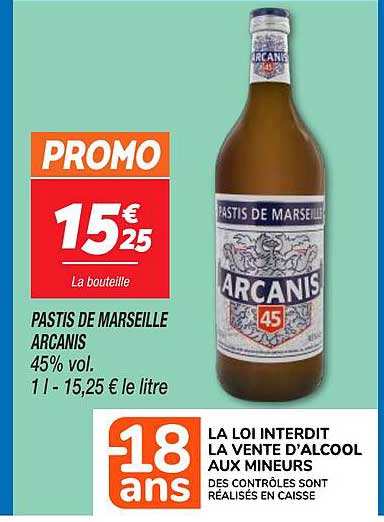 Découvrez dès maintenant la offre PASTIS DE MARSEILLE ARCANIS 45% vol. dans le catalogue de Netto. Cette offre est valable du 11/11/2025 au 17/11/2025.