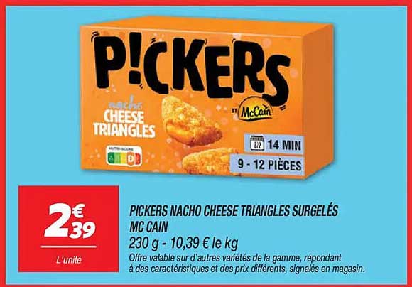 Découvrez les PICKERS Nacho Cheese Triangles de Mc Cain, une délicieuse solution rapide pour vos apéritifs ou vos repas ! Préparez-vous à savourer des triangles croustillants et fondants, parfaits pour toutes les occasions. Du 18 au 24 novembre 2025, cette offre vous permet de vous régaler à petit prix.