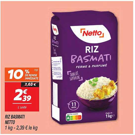 Découvrez l'offre de Riz Basmati chez Netto! Cette offre fantastique est maintenant disponible dans le nouveau catalogue de Netto. Profitez de cette occasion et économisez considérablement sur votre achat.