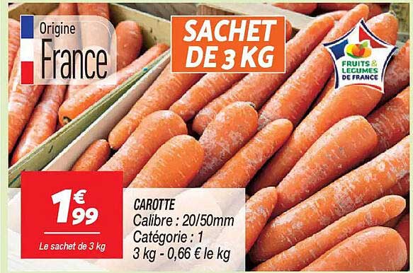 Pour seulement 1,99 € le sachet de 3 kg, vous profitez d'un prix au kilo de 0,66 €. C'est une occasion à ne pas manquer lorsque l'on sait que le prix habituel de ces carottes peut être largement supérieur. Cette offre vous permet de réaliser des économies tout en remplissant votre panier de légumes sains.