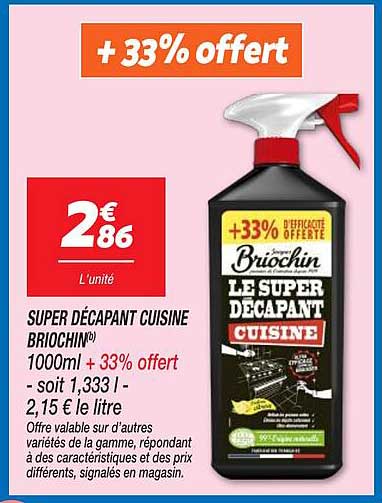 Découvrez le SUPER DÉCAPANT CUISINE BRIOCHIN®, un produit incontournable pour garder votre cuisine impeccable. Grâce à une promotion exceptionnelle, vous bénéficiez de 33% d'efficacité offerte sur ce détergent. Il est conçu pour faire face aux graisses tenaces et aux taches difficiles, vous garantissant un nettoyage rapide et efficace.