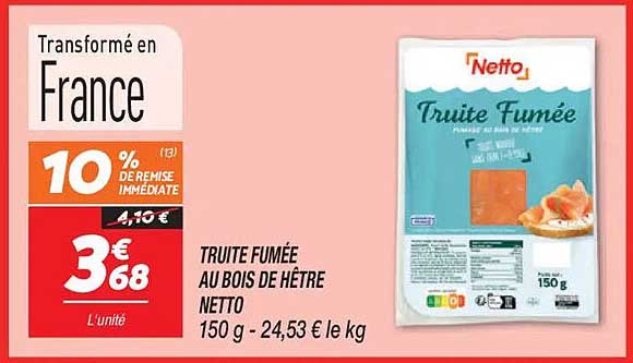 Découvrez la délicieuse truite fumée au bois de hêtre proposée par Netto. Ce produit d’exception, transformé en France, saura ravir vos papilles. Profitez d’une remise immédiate de 10 %, rendant cette offre encore plus attrayante. Que ce soit pour un apéritif entre amis ou un repas gourmet, cette truite fumée est un incontournable.