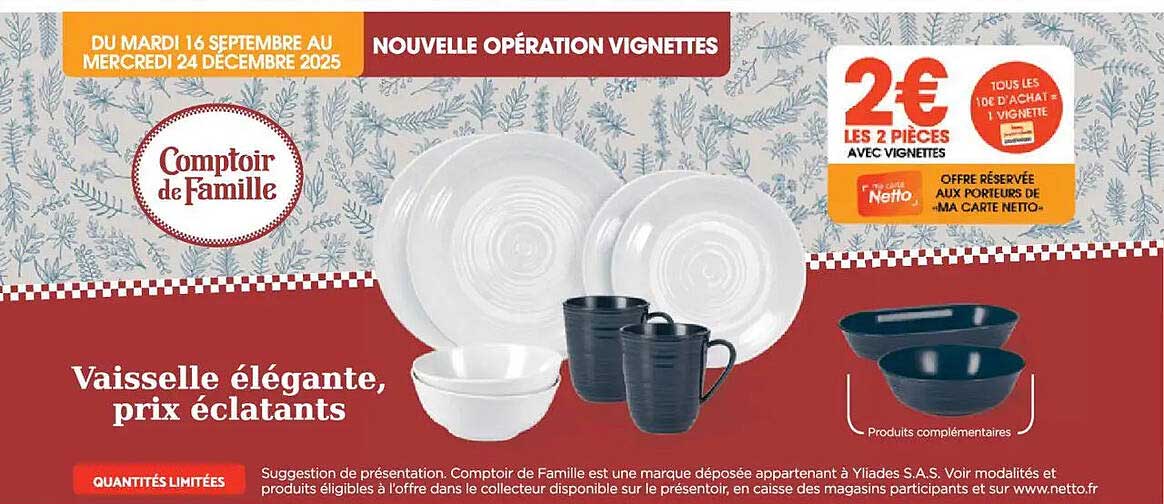 Découvrez une promotion incroyable sur une vaisselle élégante de la marque Comptoir de Famille. Du 21 au 27 octobre 2025, profitez de cette offre exceptionnelle qui vous permettra de renouveler votre service de table à petit prix. Pourquoi se contenter d'une vaisselle ordinaire quand vous pouvez avoir du style à la maison ?