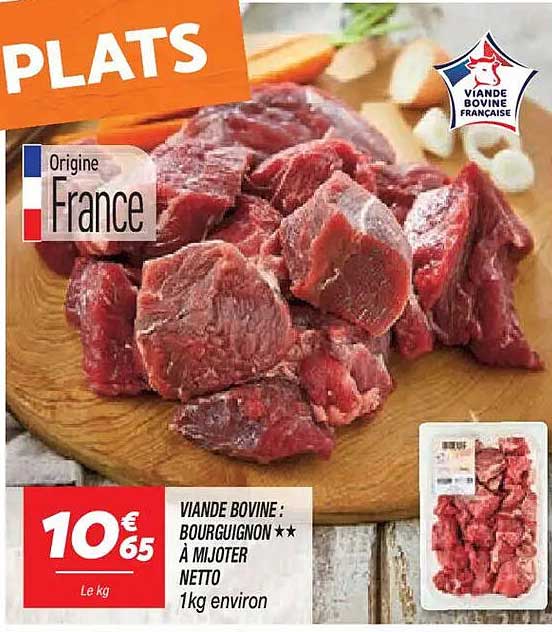 Profitez d'une offre exceptionnelle sur le bœuf à mijoter de Netto, idéal pour préparer de savoureuses recettes familiales. D'origine France, cette viande bovine de qualité saura ravir vos papilles et sublimer vos plats. Que ce soit pour un grand repas dominical ou un dîner convivial entre amis, c'est la star de votre cuisine !