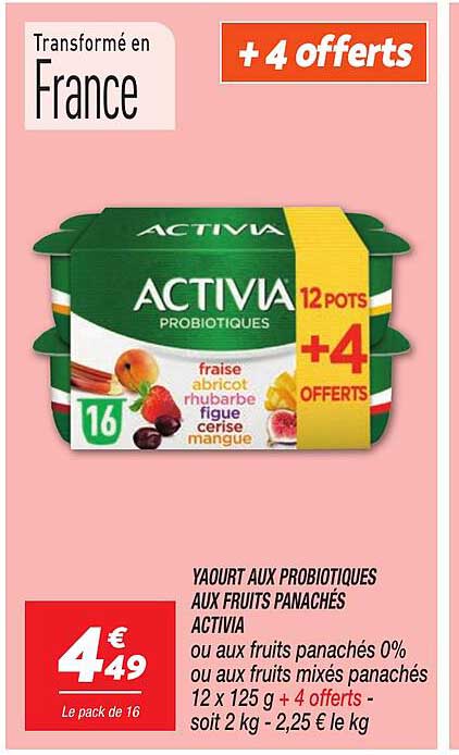 Découvrez une offre exceptionnelle sur le yaourt aux probiotiques Activia, une délicieuse option pour allier plaisir et bien-être. Profitez de 12 pots de 125 g, avec 4 pots offerts, soit 2 kg pour seulement 4,49 €. C'est le moment idéal pour prendre soin de votre santé tout en savourant des saveurs variées comme la fraise, l’abricot ou encore la cerise.
