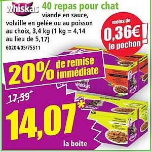Profitez de cette offre incroyable : au lieu de débourser 17,59 €, vous ne paierez que 14,07 € pour ce pack de 40 repas. Vous réalisez ainsi une économie de 20%, soit presque 3,52 € de moins ! Un choix judicieux pour votre portefeuille tout en assurant le meilleur pour votre chat.