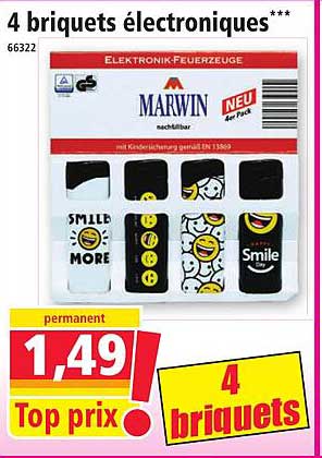 Découvrez une offre incroyable sur les briquets électroniques Marwin, spécialement conçus pour apporter une touche de fun à vos moments quotidiens. Avec ce pack de 4 briquets, non seulement vous aurez des accessoires pratiques, mais également des designs amusants qui vous feront sourire à chaque utilisation. Ne manquez pas cette occasion de vous équiper tout en ajoutant un peu de joie à votre vie !