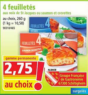 Découvrez l'offre de 4 Feuilletés Aux Noix De St Jacques Ou Saumon Et Crevettes chez Norma! Cette offre fantastique est maintenant disponible dans le nouveau catalogue de Norma. Profitez de cette occasion et économisez considérablement sur votre achat.