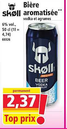 Découvrez la Bière Aromatisée Skøll, une boisson rafraîchissante qui allie la légèreté de la bière et la douceur des agrumes. Parfaite pour vos moments de détente, cette bière avec 6% d'alcool saura ravir vos palais et vous transporter sous le soleil.