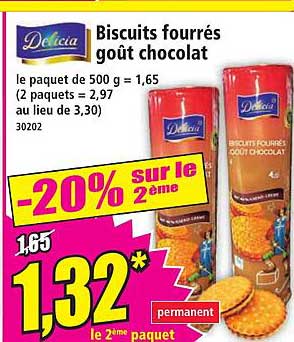 Actuellement, ces biscuits sont proposés à 1,65 € le paquet, avec une offre incroyable de -20% sur le deuxième paquet, soit seulement 1,32 € ! L'achat de deux paquets revient donc à 2,97 € au lieu de 3,30 €, ce qui fait de cette offre une opportunité à ne pas manquer.