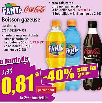Découvrez des boissons gazeuses rafraîchissantes de la marque Fanta et Coca-Cola, parfaites pour étancher votre soif à tout moment. Que ce soit pour un repas, un pique-nique ou un moment de détente, ces boissons apporteront une touche de plaisir à vos pauses. Profitez d'une réduction exceptionnelle sur la deuxième bouteille et faites le plein de saveurs sans vous ruiner.