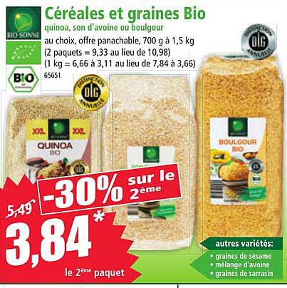 Découvrez une promotion exceptionnelle sur les céréales et graines Bio de la marque BIO SONNI. Profitez d'une réduction de 30 % sur le deuxième paquet de quinoa, son d’avoine ou boulgour. Une occasion parfaite pour enrichir vos repas avec des aliments sains et naturels !