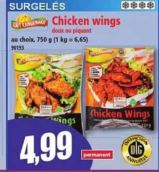 Les ailes de poulet sont un incontournable des tables conviviales, que ce soit pour un apéritif entre amis ou un repas en famille. Nous vous proposons des Chicken wings de la marque Gut Langenhof, disponibles en deux variétés : doux ou piquant. C'est une excellente occasion de savourer des plats riches en saveurs à petit prix ! En ce moment, ces délicieuses ailes sont à seulement 4,99 €.