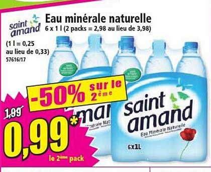 Découvrez notre incroyable promotion sur l'eau minérale naturelle Saint Amand ! Actuellement, vous pouvez profiter de deux packs de 6 bouteilles de 1L, avec un tarif exceptionnel pour le deuxième pack. C'est le moment idéal pour faire le plein de cette eau pure et rafraîchissante, tout en réalisant des économies.