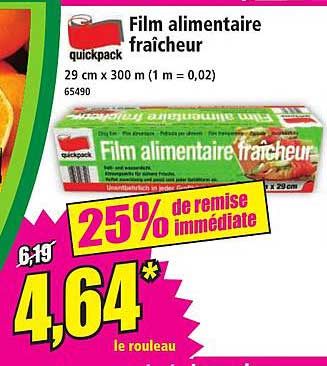 Profitez d'une remise immédiate de 25 % sur ce film alimentaire, passant de 6,19 € à seulement 4,64 € le rouleau. C'est une opportunité à ne pas manquer si vous souhaitez économiser tout en ayant un produit de qualité à disposition.