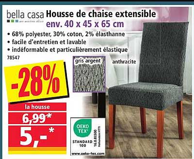 Profitez d'une réduction exceptionnelle sur la housse de chaise extensible ! Avec un design moderne et élégant, elle apportera une touche de sophistication à votre intérieur tout en protégeant vos chaises. C'est un excellent moyen de rénover votre décor sans vous ruiner.