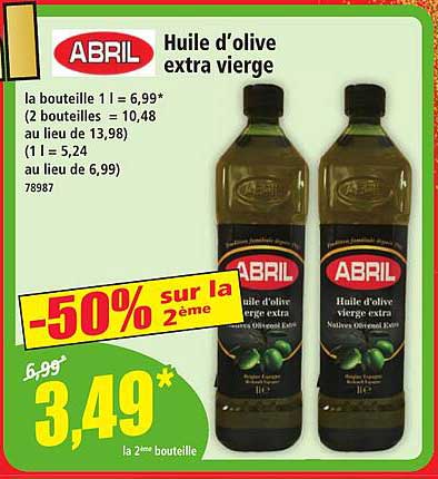 La promotion sur l'huile d'olive extra vierge de la marque Abril est une occasion à ne pas manquer ! Ce produit, prisé pour sa qualité et ses saveurs, est idéal pour rehausser vos plats. Profitez de cette offre exceptionnelle, valable du 12 au 18 novembre 2025, et obtenez une réduction de 50% sur la deuxième bouteille. Une belle manière de prendre soin de votre santé tout en faisant des économies !