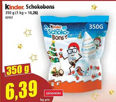 Découvrez les irrésistibles Kinder Schokobons dans cette offre spéciale ! Ces douceurs chocolatiques, au cœur tendre et fondant, sont parfaites pour agrémenter vos moments de convivialité. Que ce soit pour un goûter entre amis ou une célébration en famille, ces petites bouchées raviront les papilles des petits comme des grands.