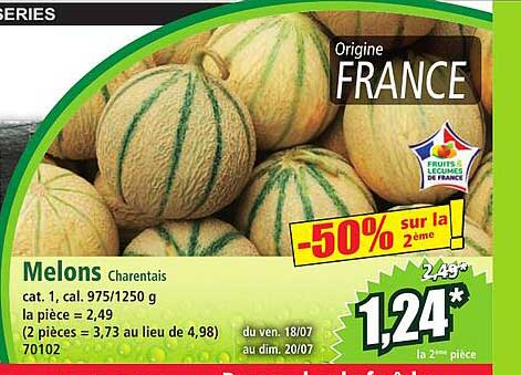 Découvrez l'offre exceptionnelle sur les melons Charentais, un fruit délicieux et rafraîchissant, parfait pour l'été ! Profitez d'une réduction de 50 % sur le deuxième melon acheté, une opportunité à ne pas manquer pour vous régaler tout en faisant des économies. Dégustez ce fruit succulent qui apporte fraîcheur et vitamine à vos repas.