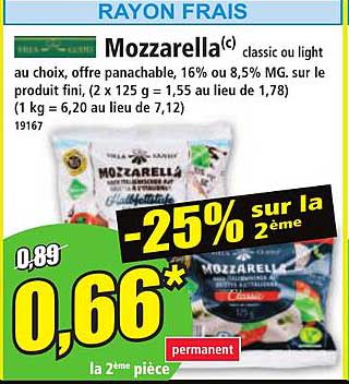 Plongez dans l'univers savoureux de la mozzarella avec cette offre exceptionnelle sur les variétés classic et light. Avec un apport en matière grasse de 16% ou 8,5%, vous avez la liberté de choisir celle qui convient parfaitement à votre régime alimentaire. Pourquoi se priver de délices crémeux et fondants quand on peut les savourer à prix réduit ? Cette promotion est idéale pour rehausser vos plats et ravir vos convives, que ce soit pour une pizza maison, une salade caprese ou pour agrémenter vos bruschettas.