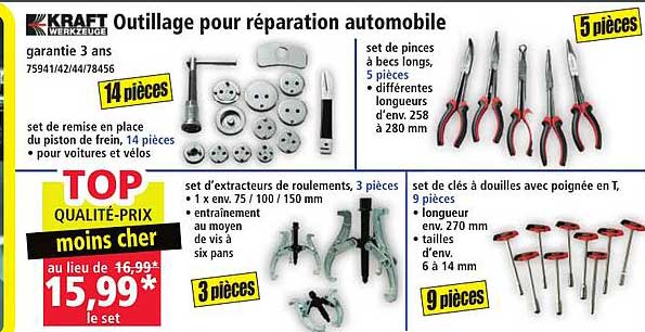 Vous êtes un passionné de mécanique ou simplement à la recherche des outils nécessaires pour entretenir votre véhicule ? Cette promotion sur l'outillage pour réparation automobile de Kraft est faite pour vous ! Avec un assortiment de 14 pièces, ce set est spécialement conçu pour les voitures et les vélos. Pendant la période du 5 au 11 novembre 2025, profitez d’une offre exceptionnelle à seulement 15,99€, au lieu de 16,99€. Une belle économie pour un produit de qualité !