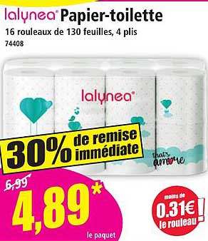 Découvrez une excellente promotion sur le papier-toilette Lalynea. Avec 16 rouleaux de 130 feuilles en 4 plis, cette offre est l'opportunité parfaite pour faire le plein d'essentiels pour votre salle de bain. Profitez de 30% de remise immédiate, une occasion à ne pas manquer pour améliorer votre confort quotidien.