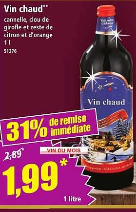 Découvrez la délicieuse offre du Vin chaud disponible chez Norma, une boisson réconfortante qui ajoutera une touche chaleureuse à vos soirées d'hiver. Avec sa recette agrémentée de cannelle, de clou de girofle et de zestes de citron et d'orange, ce vin chaud est parfait pour se rassembler autour d'une table, partager des moments conviviaux en famille ou entre amis.