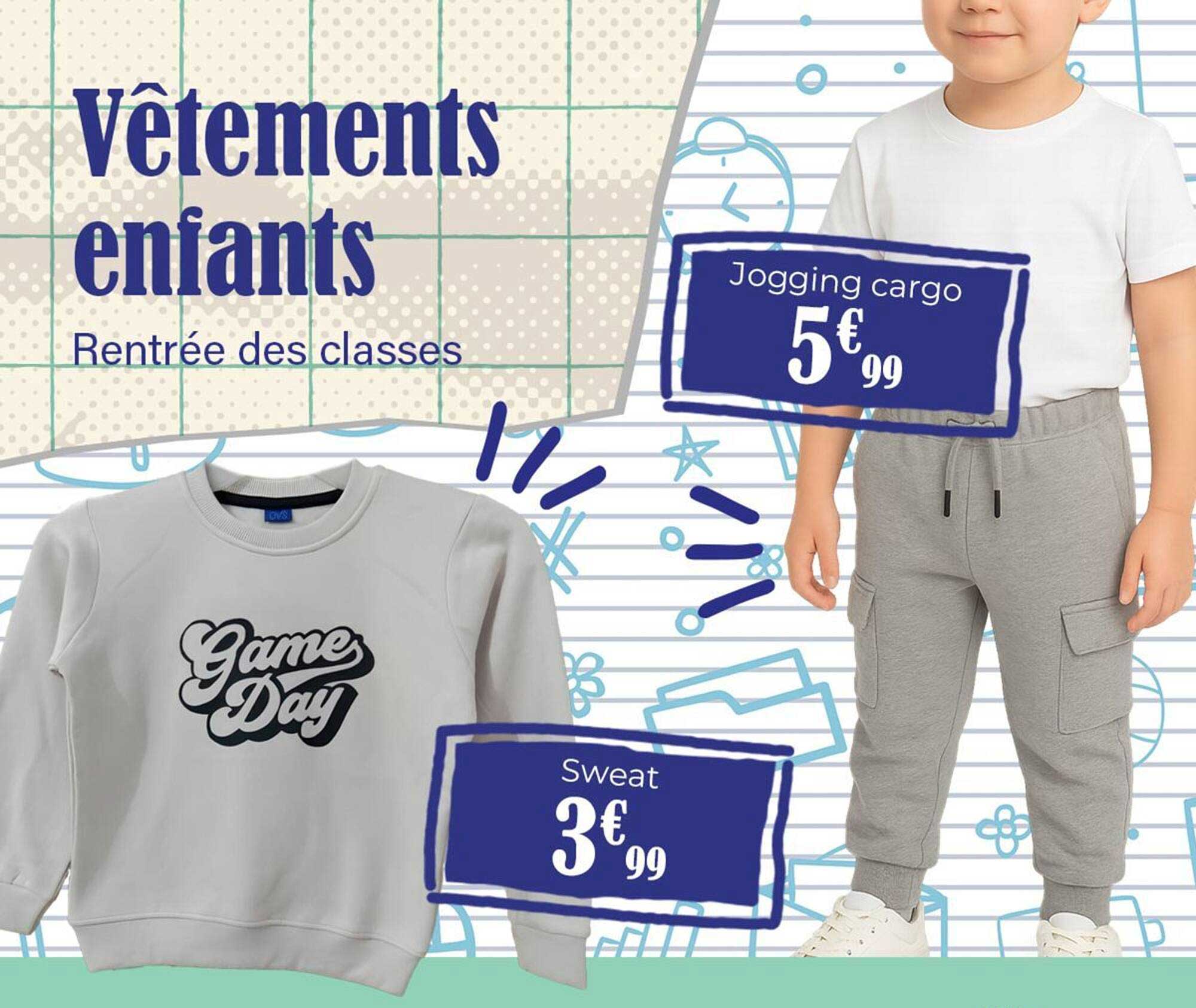 La rentrée des classes approche à grands pas, et rien de tel que de bien s'équiper pour accueillir cette nouvelle année scolaire. Découvrez notre sélection de vêtements enfants de qualité à prix imbattables. À petits budgets, vous pourrez offrir à vos petits des tenues à la fois tendance et confortables. Avec un sweat au logo dynamique et un jogging cargo stylé, vos enfants n'auront rien à envier à leurs camarades.