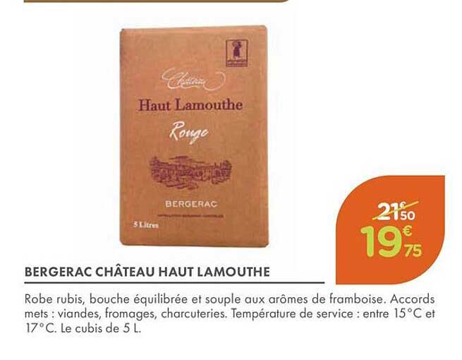 Le Château Haut Lamouthe se présente en cubitainer de 5 litres, parfait pour une utilisation prolongée. Ce vin se sert à une température idéale comprise entre 15°C et 17°C, garantissant que chaque gorgée soit un véritable plaisir pour les papilles.