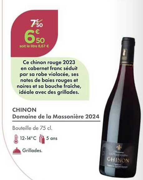 Découvrez dès maintenant la offre Chinon Domaine de la Massonière 2024 dans le catalogue de Point Vert. Cette offre est valable du 15/10/2025 au 10/11/2025.