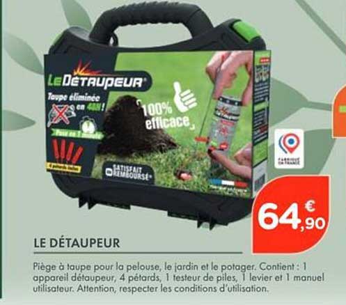 Découvrez le Détaupeur, un appareil révolutionnaire conçu pour éliminer les taupes de votre jardin, pelouse ou potager. Cet outil est parfait pour ceux qui cherchent une solution efficace et durable pour protéger leurs espaces verts. Avec une promesse d'efficacité de 100%, il est temps de dire adieu aux désagréments causés par ces petites bêtes.