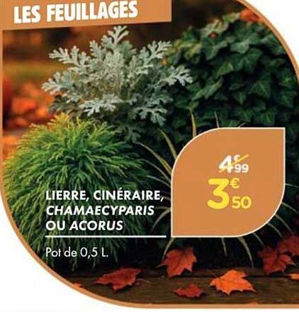 Découvrez une offre exceptionnelle sur la sélection de feuilles d'intérieur et d'extérieur ! Du 15 octobre au 2 novembre 2025, le pot de 0,5 L comprenant du lierre, cinéraire, chamaecyparis ou acorus est proposé à un prix très attractif de 3,50 € au lieu de 4,99 €. C'est l'occasion idéale de donner un nouvel éclat à votre jardin ou votre intérieur tout en réalisant des économies.
