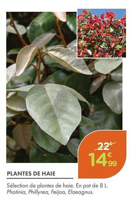 Si vous envisagez d'embellir votre jardin ou votre terrasse, ne manquez pas cette promotion exceptionnelle sur les plantes de haie. Disponibles en pot de 8 L, ces magnifiques variétés, incluant Photinia, Phyllirea, Feijoa et Elaeagnus, sont parfaites pour créer une belle délimitation tout en apportant une touche de verdure à votre espace extérieur. Cette offre est valable du 7 au 12 octobre 2025, alors profitez-en rapidement !