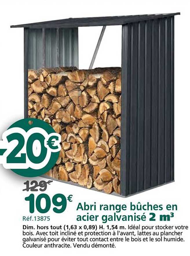 Profitez de l'excellente promotion sur l'abri range bûches en acier galvanisé, idéal pour protéger votre bois de chauffage des intempéries. Avec une réduction de 20 €, vous pouvez l'acquérir à seulement 109 € au lieu de 129 €, une offre à ne pas manquer!