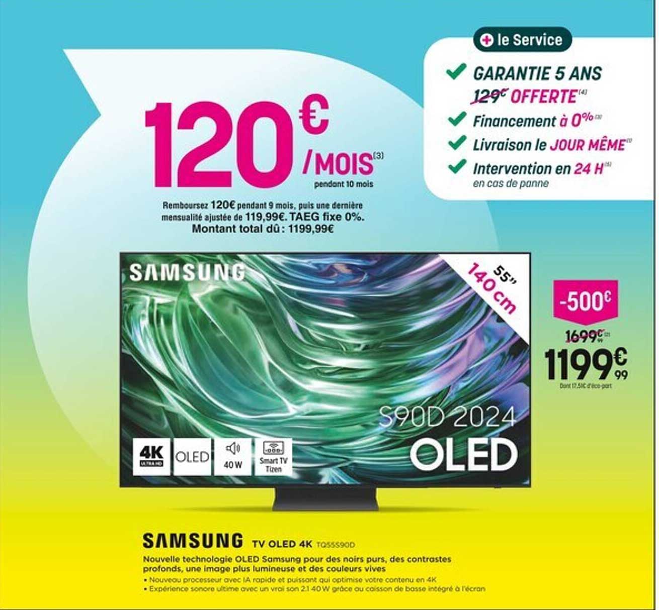 Actuellement disponible à 1199,99 €, cette télévision vous permet d'économiser 500 € par rapport à son prix habituel de 1699,99 €. De plus, vous avez la possibilité de payer en plusieurs fois avec une mensualité de 120 € pendant 10 mois, ce qui rend cet investissement plus accessible que jamais.