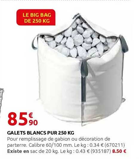 Découvrez notre offre exceptionnelle sur le big bag de galets blancs pur, parfait pour tous vos projets d'aménagement extérieur. Que ce soit pour remplir un gabion ou pour la décoration de vos parterres, ces galets de calibre 60/100 mm apporteront une touche élégante et naturelle à votre espace. Ne manquez pas cette bonne affaire, disponible ici !