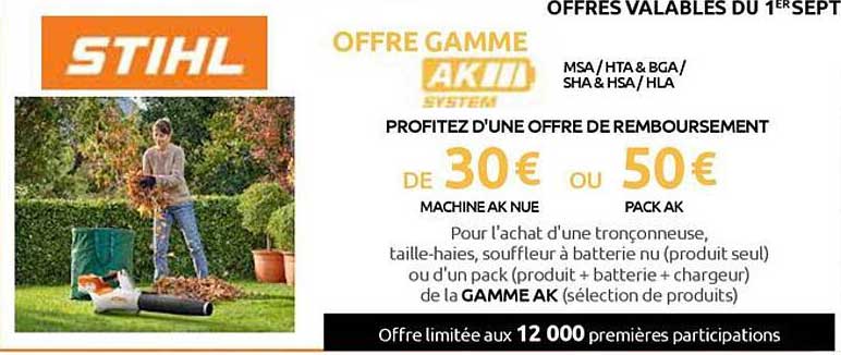 Découvrez une occasion inédite de faire des économies sur la gamme AK III de STIHL. Profitez d'une offre de remboursement allant jusqu'à 50 € ! Que vous souhaitiez acquérir une tronçonneuse, une taille-haies, ou un souffleur à batterie, cette promotion est idéale pour équiper votre jardin sans vous ruiner. Valable du 1er septembre jusqu'à épuisement des stocks, c’est une offre à saisir rapidement.