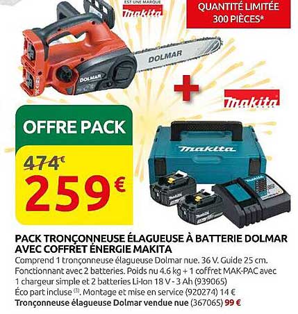 Découvrez une occasion unique de vous équiper avec le pack tronçonneuse élagueuse à batterie Dolmar, un choix parfait pour tous vos travaux de jardinage et d'élagage. Ce pack inclut également un coffret d'énergie Makita, rendant cette offre encore plus attrayante. Profitez de cette offre incroyable qui vous permettra de réaliser des économies substantielles sur un équipement de haute qualité.