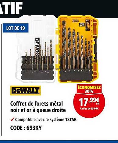 Découvrez le coffret de forets métal noir et or de la marque DeWALT, un incontournable pour tous vos projets de bricolage. Avec cette offre, profitez d'une réduction de 30 % sur un produit de qualité, idéal pour les bricoleurs avertis comme les professionnels.