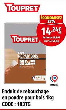 Découvrez l'enduit de rebouchage en poudre pour bois de la marque Toupret, une solution idéale pour toutes vos finitions et réparations en bois. Que vous soyez un professionnel ou un amateur de bricolage, cet enduit est conçu pour vous simplifier la vie. Profitez d'une réduction exceptionnelle de 25%, une véritable aubaine pour préparer vos projets avec efficacité !