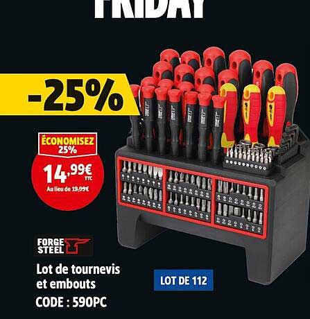 Découvrez une offre incroyable sur un lot de tournevis et d'embouts de la marque Forge Steel, parfait pour tous vos projets de bricolage. Avec une réduction de 25 %, vous pouvez acquérir cet ensemble complet à un prix très compétitif. Que vous soyez un professionnel ou un amateur de bricolage, cet outil est un indispensable à avoir dans votre kit.